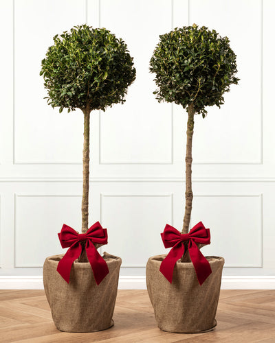 A classic, bushy Buxus Ball on a standard lollipop stem that is ideal for a patio or balcony, complete in a rustic gift bag with a stylish Christmas bow. A perfect gift for plant lovers to be enjoyed long after the festive season has passed.