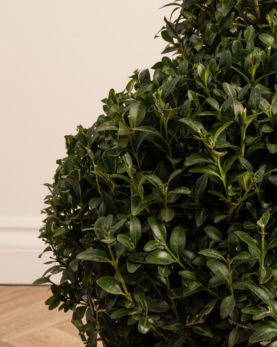 A classic Buxus Bush boasting an elegant, spiral shape, complete in a rustic gift bag with a classic red Christmas bow. A perfect gift for garden lovers to bring year-round interest, allowing them to enjoy it long after the festive season has passed.