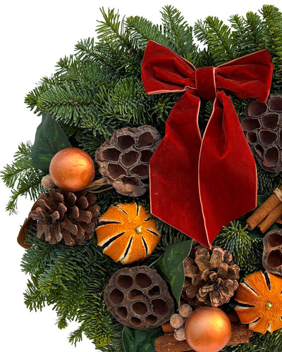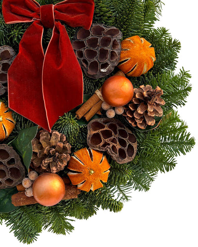 The Cinnamon Spice Christmas Wreath is cheerful and aromatic, making the ideal addition to your festive décor. Adorned with cinnamon sticks on dried winter fruits, this striking wreath emits a classic Christmassy scent.
