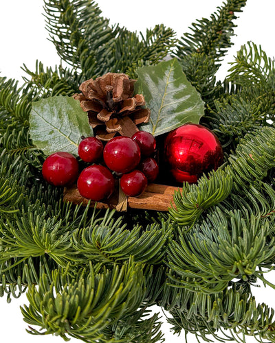 The Christmas Grave Posy is the ideal adornment for your loved one’s graveside this Christmas season. It is carefully crafted from real Noble Fir and tastefully decorated with seasonal ornaments in a traditionally festive red and green colour scheme.
