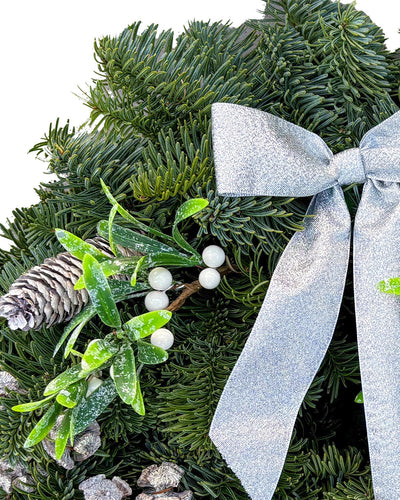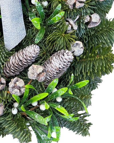 Brimming with seasonal charm, this Mistletoe Kisses Wreath is the perfect festive adornment for the front door. The all-natural lush evergreen foliage is tastefully decorated with mistletoe, frosted fir cones, and a crisp silver ribbon bow, creating a wintry design in traditional Christmas colours.